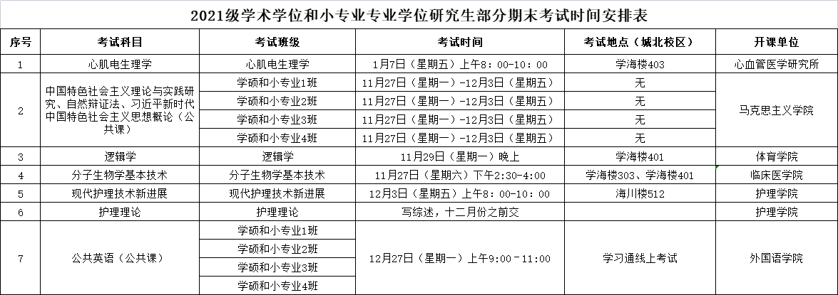 2021级学术学位和小专业专业学位研究生部分期末考试时间安排表