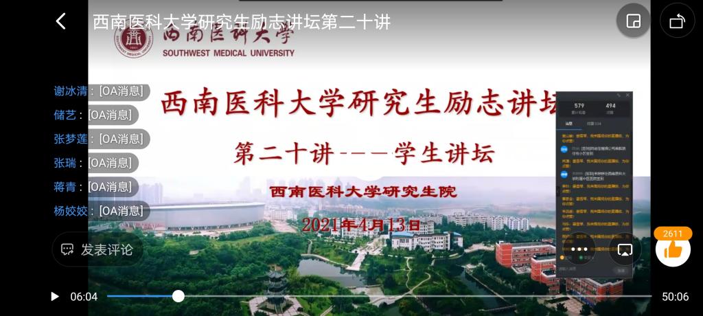 黄棋以“以梦为马 不负韶华”为题,从科研生活——理论学习、科研实践、申请课题、论文投稿等多方面给研究生们分享经验,答疑解惑;又从生活方面——泸州美食、泸州夜景、朋友聚会等方面分享的多姿多彩的研究生生活。