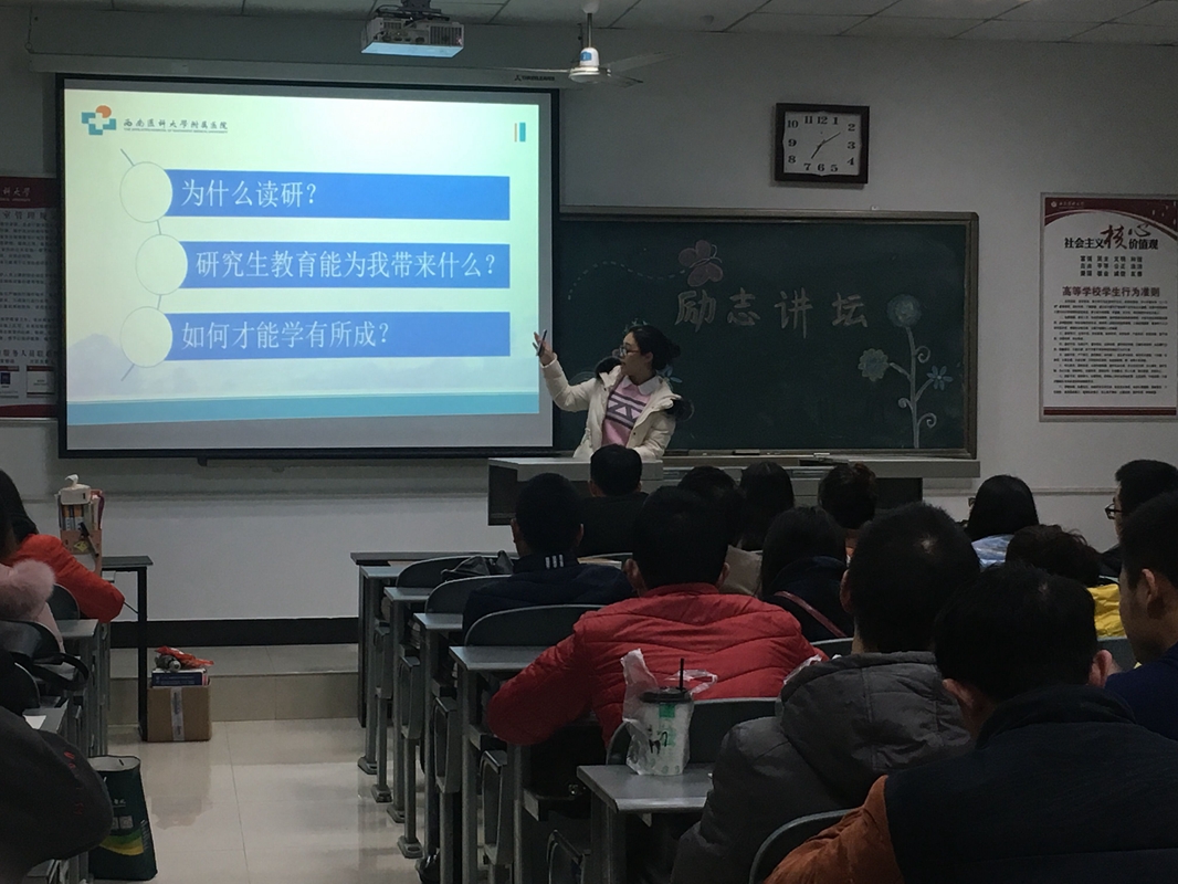 为了拓展研究生学术研究视野,激发创新思维,使研究生们更合理的规划学习和生活,日前,研究生学院研究生“励志讲坛”(第二讲)——学生讲坛在忠山校区粒香苑402举行。本次讲坛由研究生院主办,校研究生会承办,邀请了临床医学院2015级研究生会主席杨萍,2015级肿瘤学研究生谢芳,2015级护理学研究生雷铖作了关于“励志”的专题讲座。