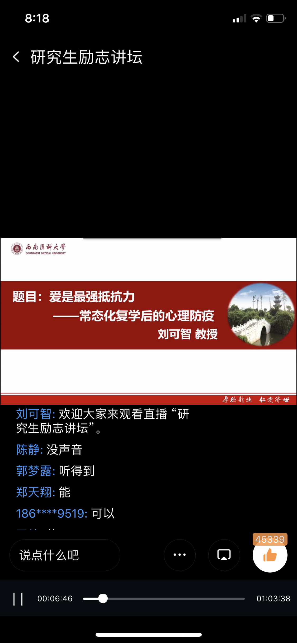 5月28日晚,研究生院主办的研究生励志讲坛第十六讲——专家讲坛在钉钉平台成功举行,我校精神医学教研室主任刘可智教授,为大家带来了一场关于“爱是最强抵抗力——常态化复学后的心理防‘疫’”讲座。刘教授以“爱”为切入点,生动详细地诠释了“爱的5种能力”以及“爱的5种语言”,引导大家学会关爱别人,学会被爱。刘教授也从多层次、多角度讲授了如何控制情绪,引导研究生们正确积极的思考问题、解决问题,传播正能量。