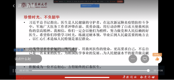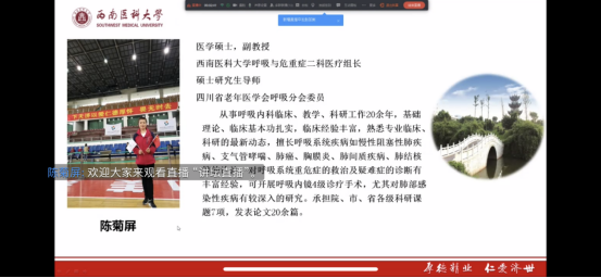 616日晚,研究生院主办的研究生励志讲坛第十——专家讲坛在钉钉平台成功举行,我校呼吸与重症二科副教授陈菊屏,为大家带来了一场关于牢记使命 勇于担当讲座。陈菊屏副教授此次“新冠”疫情援鄂的亲身经历背景,引导大家坚定医者的初心和使命,鼓励大家自立自强、立志成才、报效祖国,积极成为方得始终的后备医生