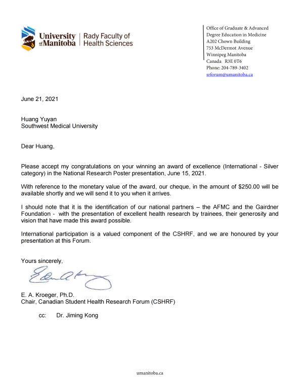 为进一步加强我校研究生的对外学术交流,经国际合作交流处联系,研究生院推荐了10名研究生参加在加拿大曼尼托巴大学举办的“第34届加拿大医学生健康研究论坛”。受疫情影响,本次论坛改在线上举行,来自中国和加拿大17所医学院的149名学生参赛,共159个项目参加展评。参赛学生均经过每个大学初赛选拔,并且需是学习成绩前5%的学生才有资格参加,我校研究生今年获得邀请参会。该论坛由加拿大国立卫生研究院资助,每年邀请国际学生参赛。经过线上报名、上传资料、自我陈诉和专家提问等多项环节,我校护理学院研究生黄雨滟报告的“基于信息技术门诊患者呼吸道传染病防控方案的构建与应用”项目获得了银奖(International - Silver Category)。