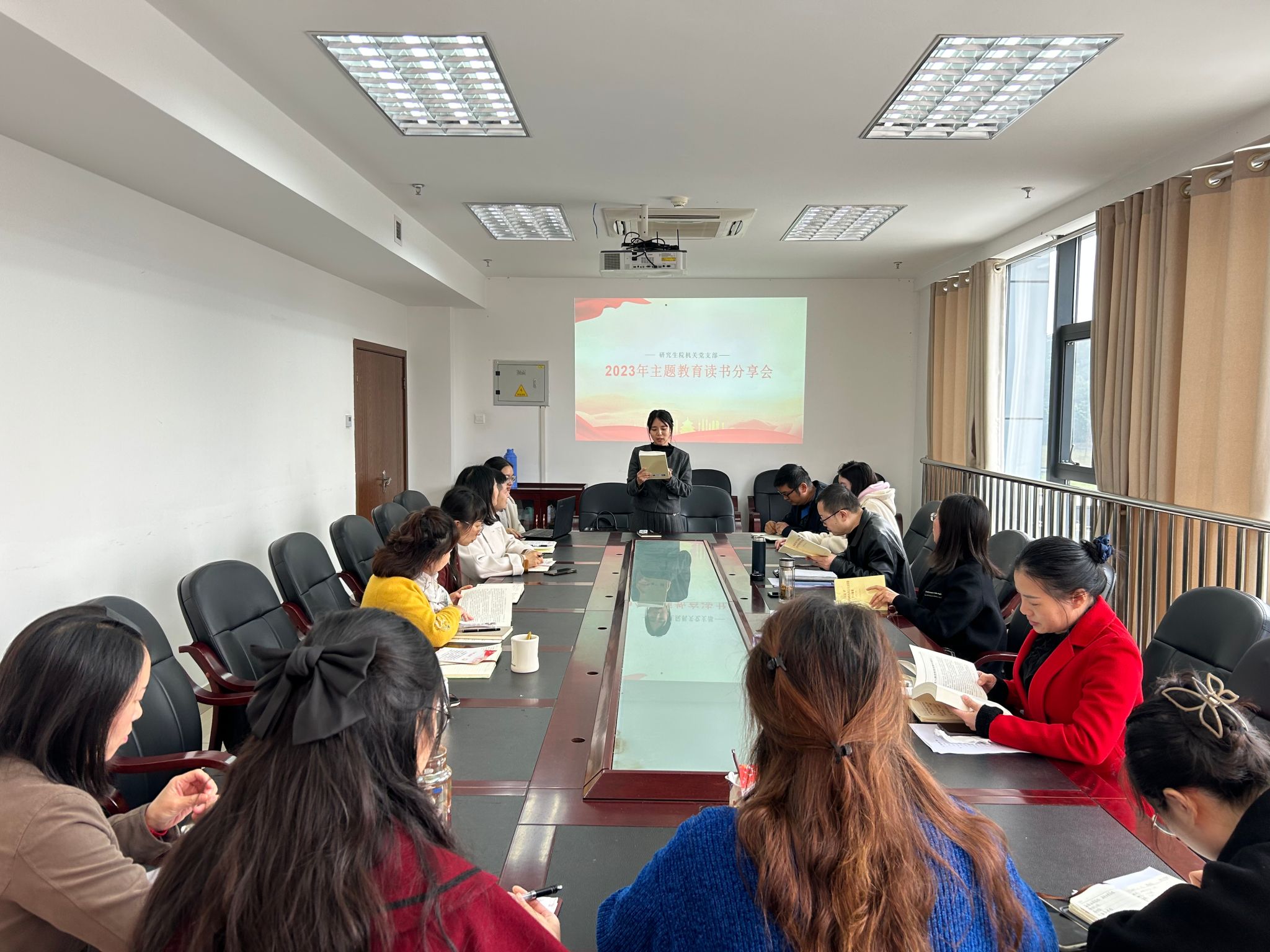11月27日上午10点,在311会议室研究生院机关党支部召开了主题教育读书分享会。会上,支部党员依次分享了自己的读书心得,大家围绕《中国共产党章程》《党的二十大报告》《习近平著作选读》《习近平新时代中国特色社会主义思想学习纲要》《习近平新时代中国特色社会主义思想专题摘编》等书进行了交流,大家从书籍的纲要和自己感悟比较深的章节作了分享。大家一致认为此次读书分享会的形式对学习很有帮助,通过分享能增加自己对书籍的理解,也可以结合实际工作进行思考讨论,学习兴趣得到提高,学习效果也明显。读书分享会后,支部还为下半年入党的党员过了政治生日。