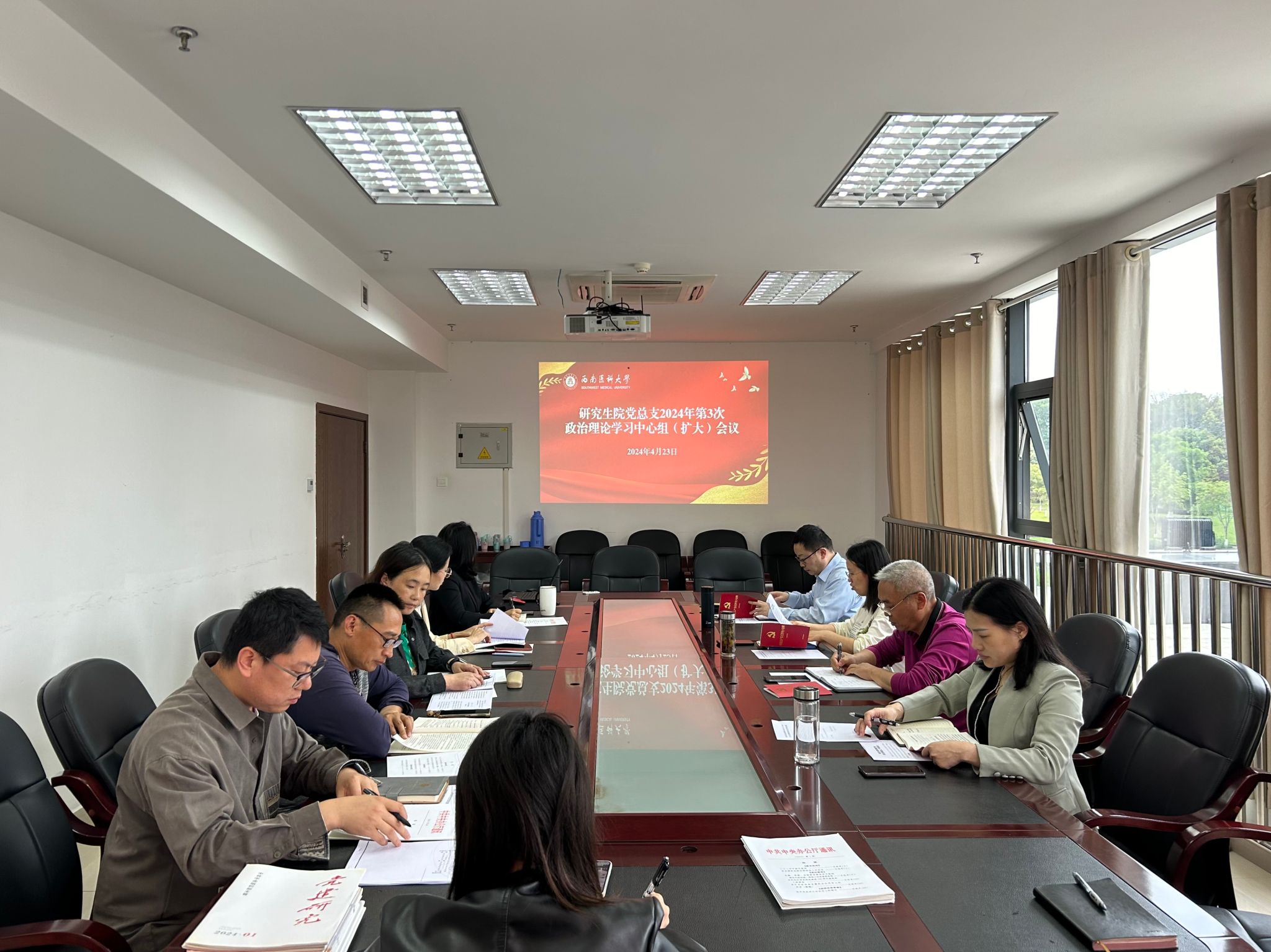 4月23日14:30在311会议室召开研究生院党总支2024年第3次政治理论学习中心组(扩大)会议暨处级领导干部党纪学习教育专题读书班。研究生院党总支全体委员、全体党支部书记,研究生院处科级领导干部参加了学习会议。会议由研究生院党总支书记朱小平主持。